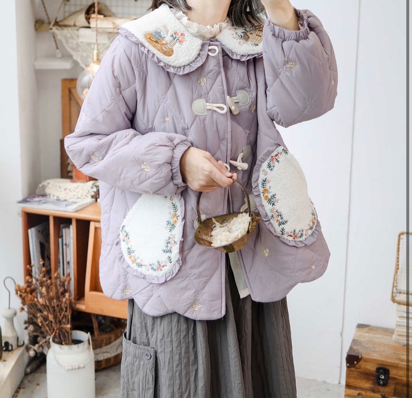Nakışlı Düğmeli Bohem Mor Kışlık Mont