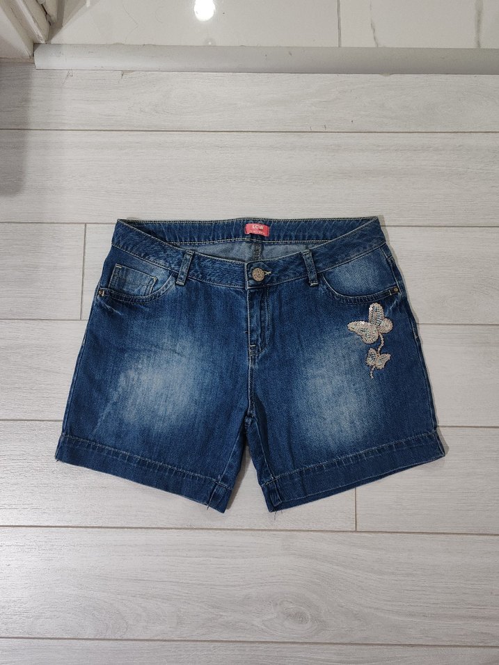 Mavi kot şort, düğmeli ve gevşek kesimdir. Renkli kelebek nakışlarıyla günlük sokak stiline uygundur.