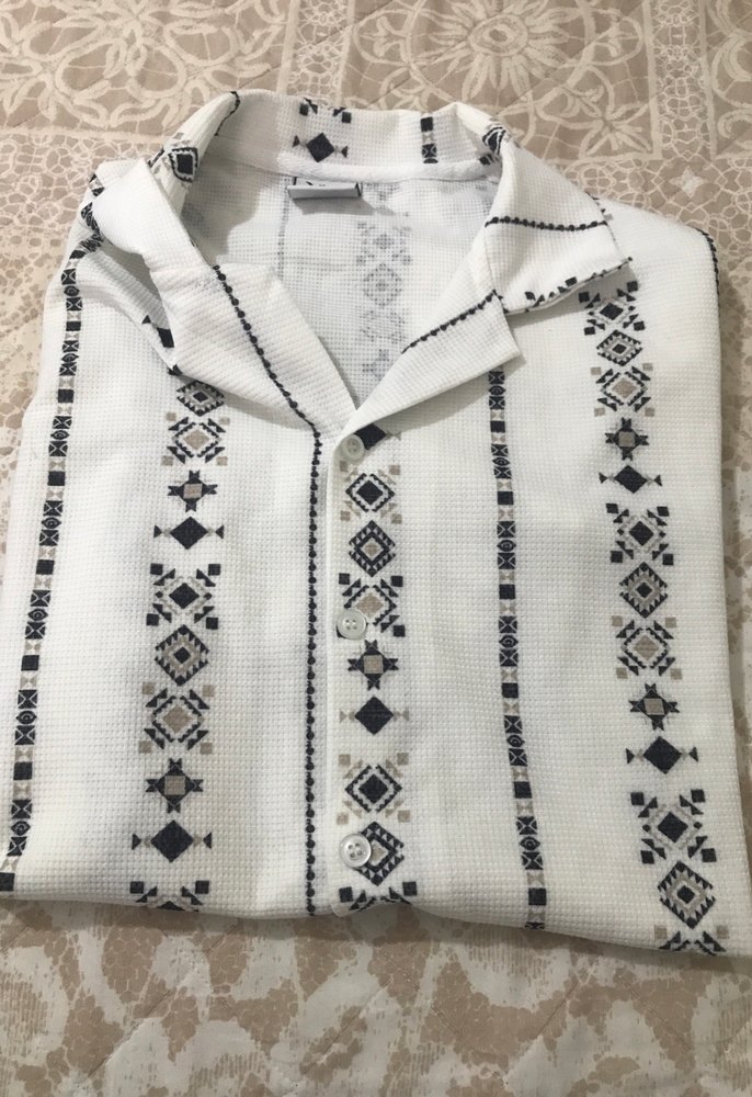 Gri nakışlı desenlere ve düğmeli kapanışa sahip, kısa kollu, tekne yaka, bol kesim kadın gömleği. Yumuşak dokulu kumaştan üretilmiştir.