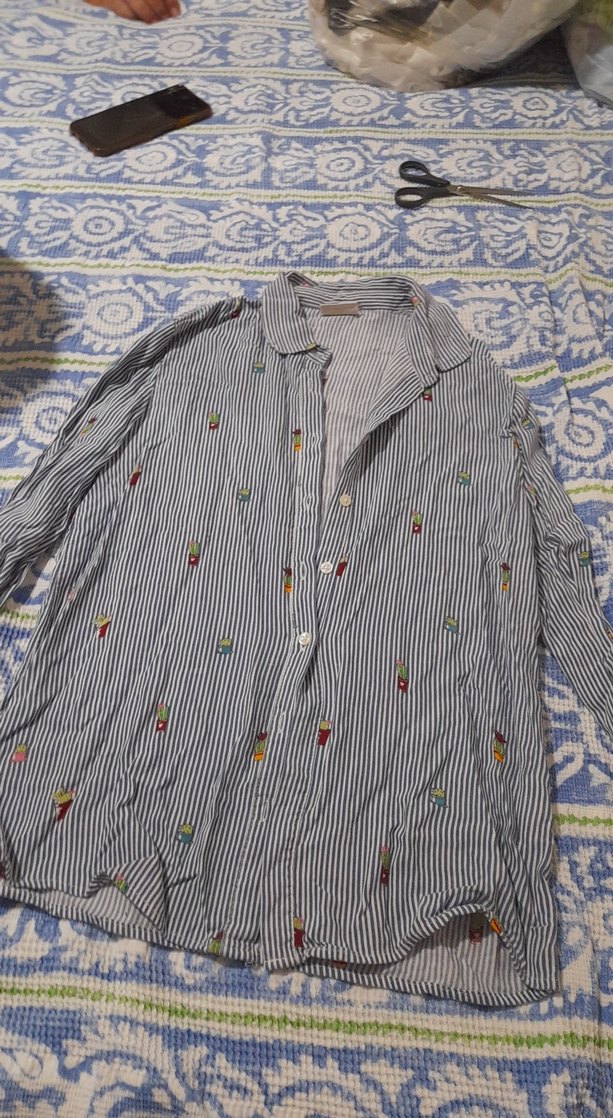 Düğmeli, uzun kollu bohem tarzı kadın gömleği. Gri çizgili kumaş üzerinde çok renkli nakış desenleri vardır. Salaş kesim ve normal midi boydadır.