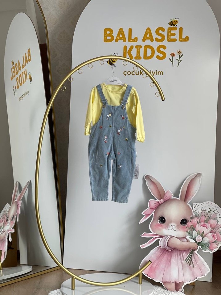 Düğmeli ve nakışlı gri denim erkek çocuk salopet, sarı uzun kollu tişörtle kombinlenmiş. Rahat ve gündelik tarzda. 6-9 ay ve 9-12 ay bedenleri mevcut ölçü atarak kargoluyorum adet fiyatıdır