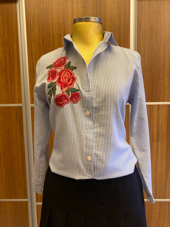 Nakışlı çiçek desenli, düğmeli, gri renkli kadın gömlek. Uzun kollu ve kesik yakalı, regular fit ve kısa boyda, ofis için uygun.