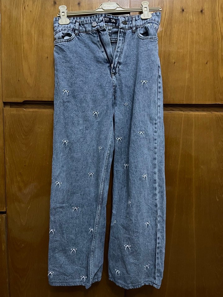 Gri mavi denimden yapılmış, bol kesim ve düğmeli, nakış detaylı kadın kot pantolon, günlük sokak stili için uygundur.