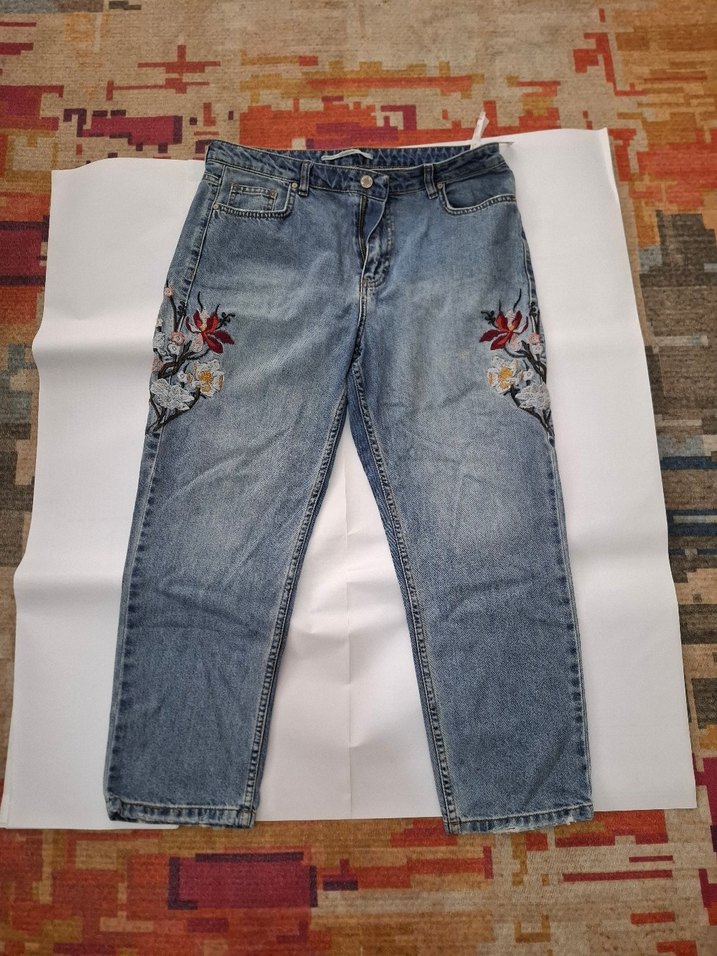 Gri-mavi renkte, yanları nakışlı, düğmeli, midi uzunlukta, bol kesim kadın kot pantolon. Günlük rahat kullanım için uygundur.