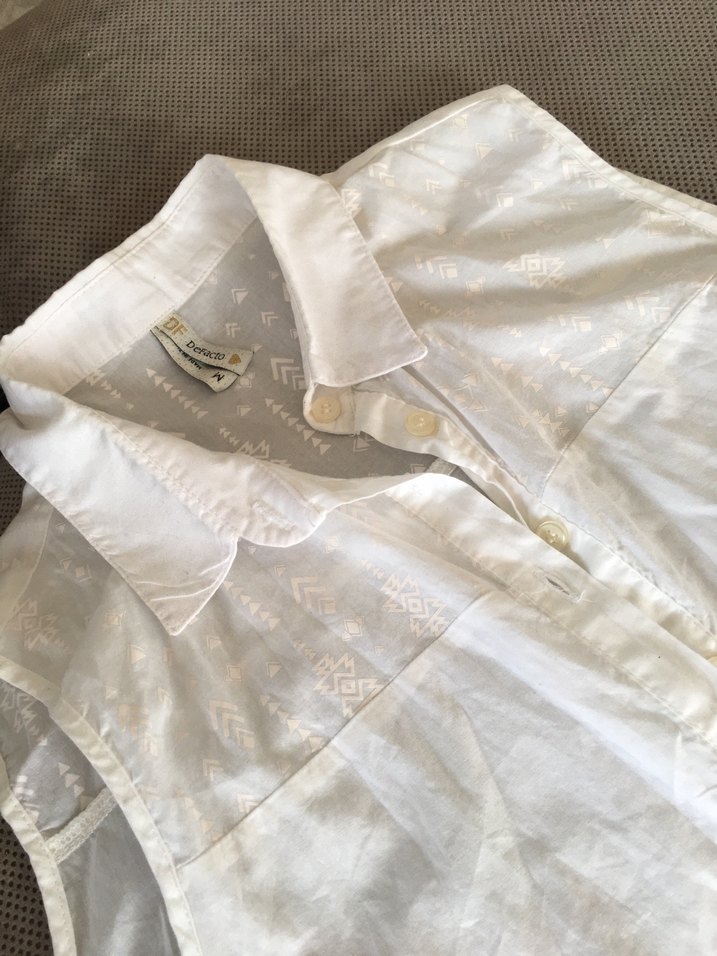 Bol kesim beyaz keten gömlek, yakalı ve kısa kollu, ince nakışlı desenlere sahip. Bohem ve vintage tarzlara uygun, ofis için ideal.