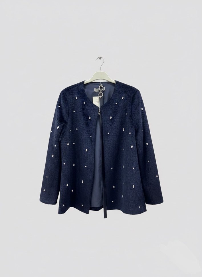 Mavi kot kumaştan, uzun kollu, düğmeli kısa ceket. Nakış detayları ve keskin yaka ile günlük kullanıma uygun rahat kesim.