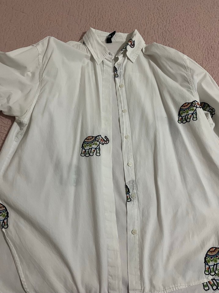 Pamuklu, bol kesim, uzun kollu beyaz gömlek. Üzerinde renkli fil nakışları ve düğmeli önü bulunur. Yaka tipi klasik, günlük ve bohem tarzda. Boy uzunluğu görselde yer almaktadır