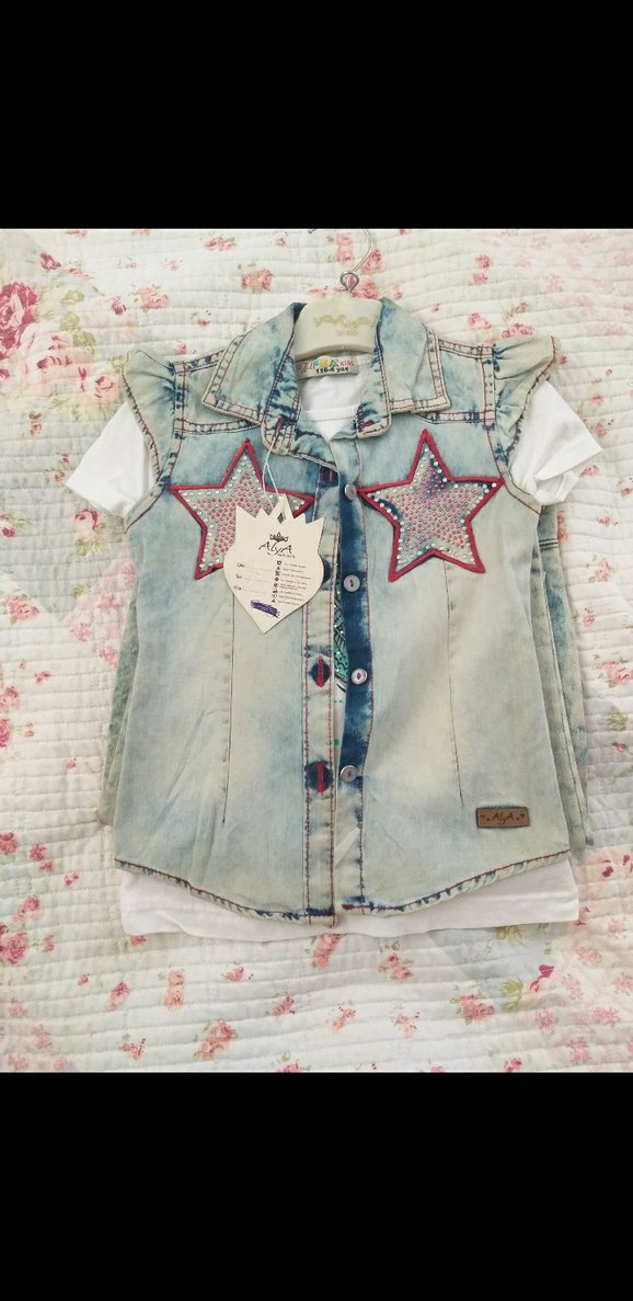 Pastel mavi tonlarda, nakışlı yıldız desenli, düğmeli ve yakalı kız denim yelek. Fitted kesim ve kolsuz tasarım rahat bir sokak stili sunar. Taşlı bluz ve taşlı pantolon takım. ⭐