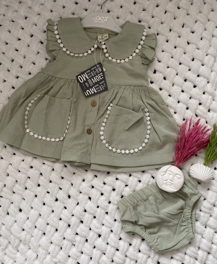 Nakışlı detaylı, düğmeli, kısa kollu, yakalı, bol kesim keten elbise. Yanında uyumlu külotlu şort ile birlikte. Yumuşacık bir kumaşı vardır yeni ve etiketlidir sadece 3-6 ayı kalmıştır