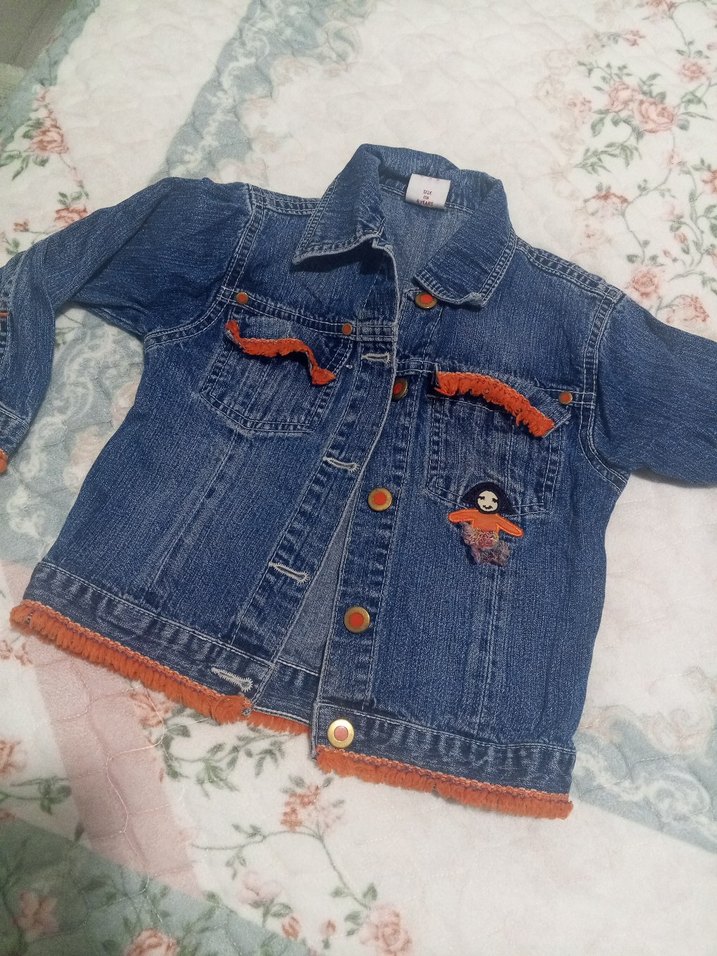 Bu kız çocukları için dar kesim mavi kot ceket, yaka kısmı kesimli ve düğmeli kapamalıdır. Renkli nakış detayları ve turuncu fırfır süslemeleriyle trend sokak modasına uygundur.