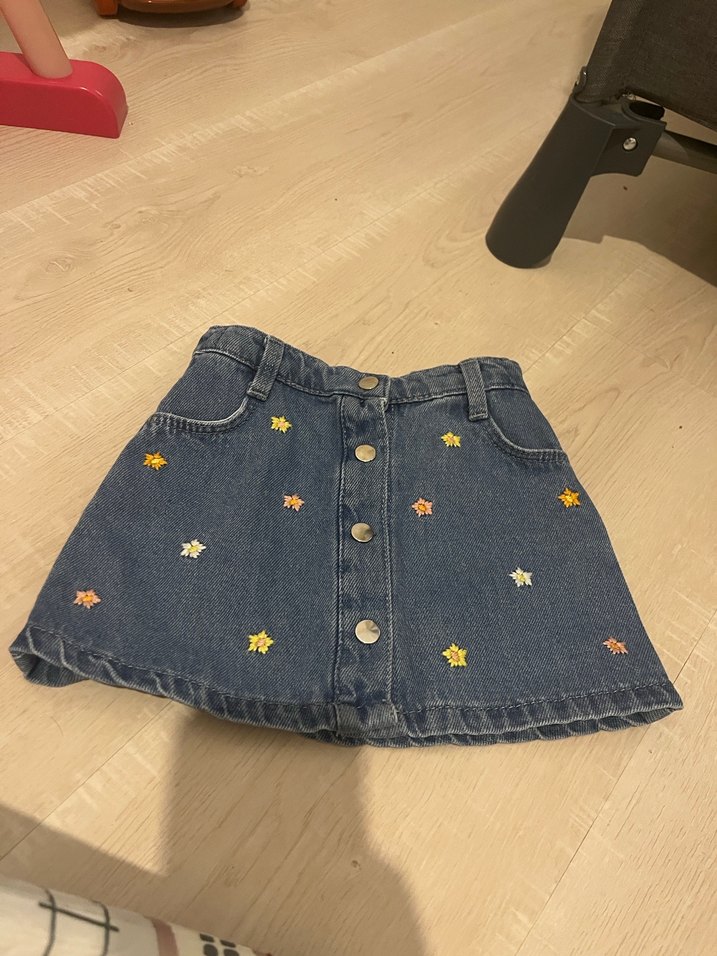 Düğmeli ve pastel renklerde nakışlı yıldız desenleri olan bol kesim kız çocuk kot eteği, rahat sokak stili için uygundur. 2 kere giyildi