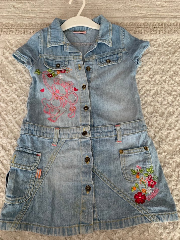 Kısa kollu, düğmeli ve nakışlı renkli detaylara sahip kız çocukları için fitted denim elbise. Sokak modası tarzında, retro esintili.