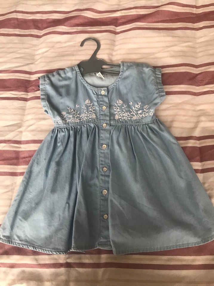 Düğmeli, nakış işlemeli, geniş kesim kız çocuk denim elbisesi. Kolsuz ve rahat kullanıma uygun.