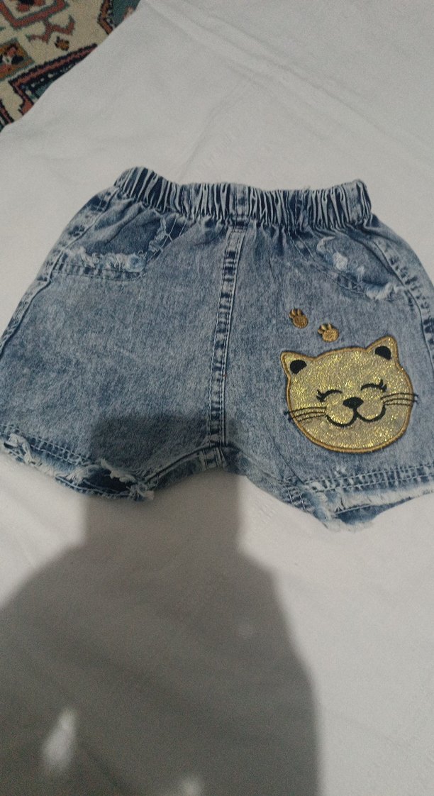 Düğmeli ve nakışlı parlak mavi kot şort, bol kesimiyle trend sokak tarzına uygundur.