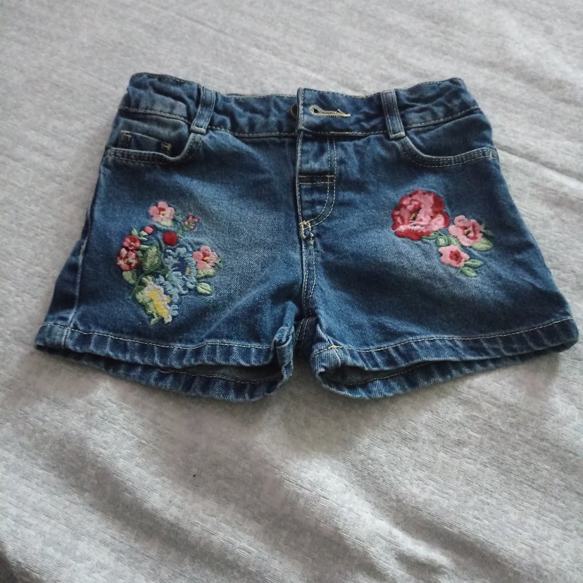 Renkli nakışlı çiçek desenleri ve düğmeli kapanışı olan bol kesim mavi kot kız şort. Arka cebinde sökük vardı dikildi sadece. Etiketi 4-5 yaş . Bel ve boy ölçüsü resimde mevcut