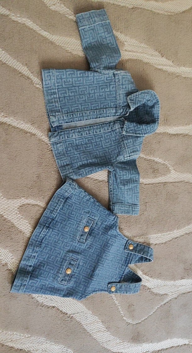 Nakışlı desenli, düğmeli askılı kız kot tulum. Yanında uyumlu kot ceketle sokak stiline uygun. 3lu takım Süper.otesi