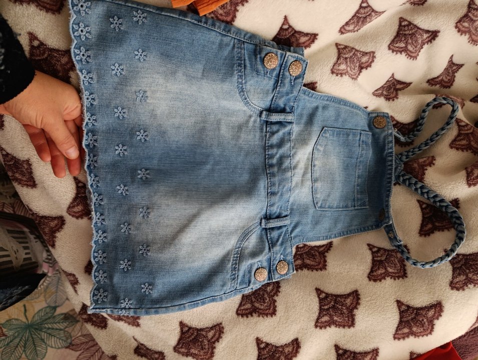 Düğmeli ve nakışlı desenlere sahip, mavi renkli, fitted kesim kız kot tulumu. Askılı ve sokak tarzı için uygun.