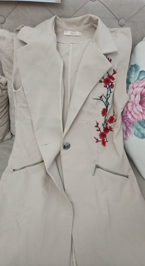 Kolsuz, bej renkli blazer, düğmeli ve yakası kesik. Nakışlı çiçek desenleri ve fermuarlı cepleri bulunur, ofis için uygun.