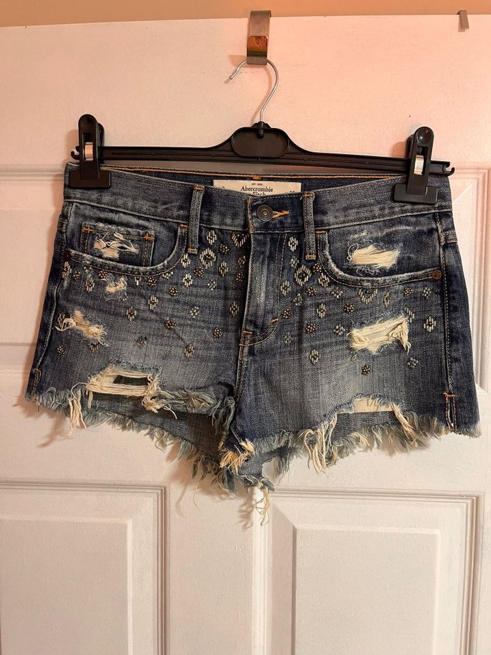 Düğmeli, nakışlı detaylara sahip koyu mavi mini denim şort. Bohem tarzda, rahat kesim, romantik buluşmalar için uygun.