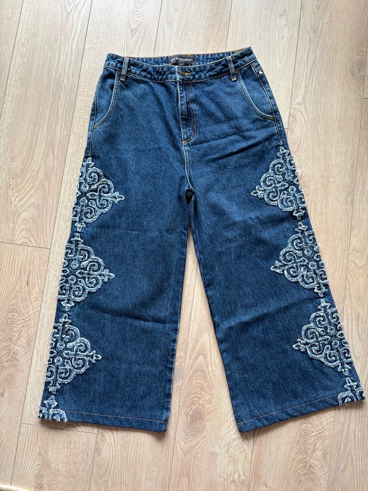 Lacivert kot pantolon, bol kesim ve düğmeli. Nakış detaylarıyla günlük kullanıma ve sokak stiline uygun midi boyda. Hiç giyilmedi