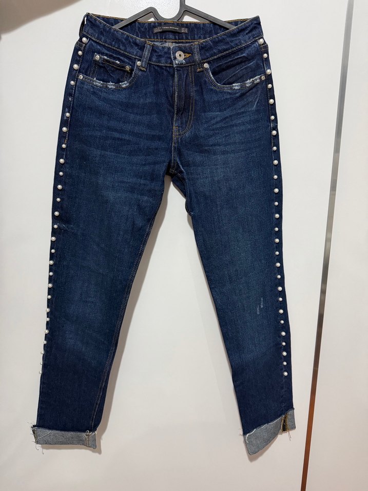Düğmeli ve yanları nakış detaylı lacivert kadın denim pantolon. Regular kesim ve midi boy, günlük kullanım için uygundur. ✨