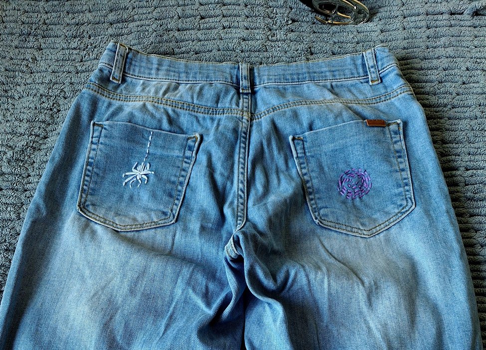 Mavi, bol kesim ve kişisellestirilmiş kot pantolon. Düğmeli ve arkada nakışlı cepleri vardır, rahat ve retro tarzı yansıtır. ✨