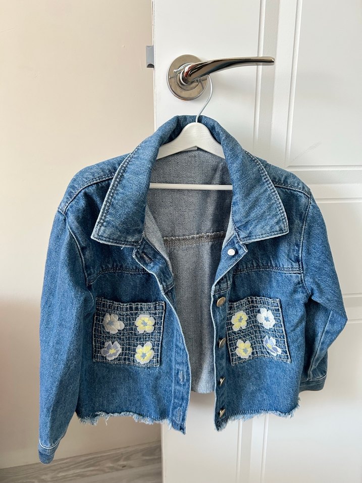 Mavi denim kumaştan, düğmeli ve nakışlı çiçek desenli cep detaylarına sahip, bol kesim uzun kollu midi boy ceket. Rahat ve günlük kullanıma uygun.