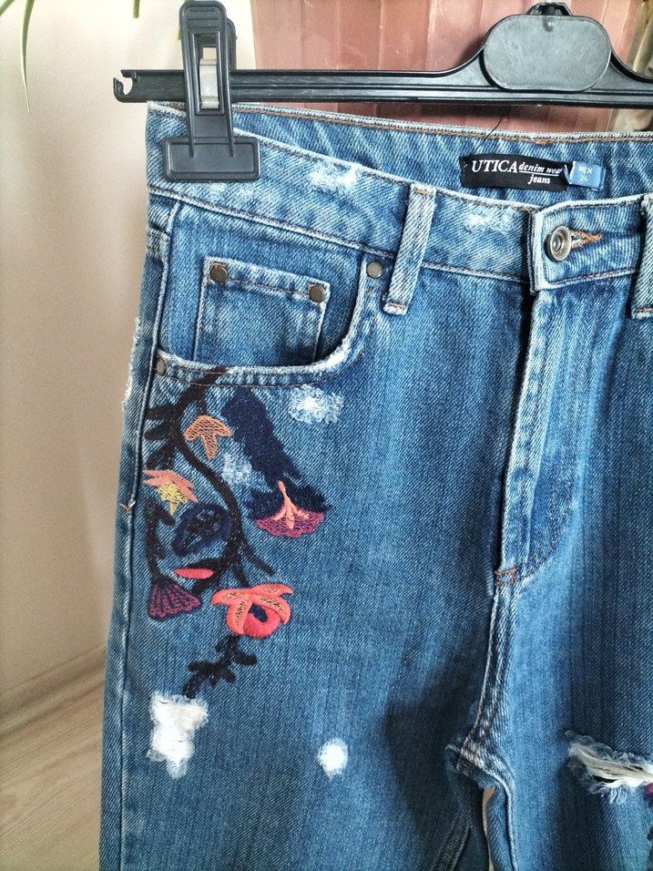 Uzun paçalı, nakışlı cep detaylı koyu mavi denim pantolon. Düğmeli ve bol kesim, günlük sokak stili UTICA markası.