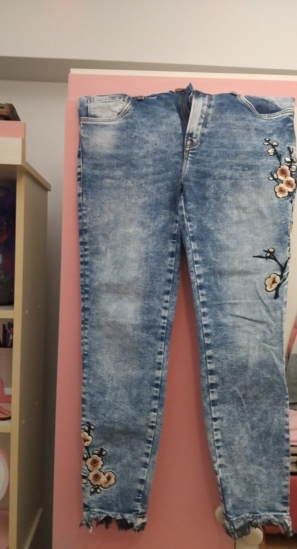 Nakışlı çiçek desenli, düğmeli, pastel mavi kot pantolon. Normal boy ve regular fit, günlük sokak stili için uygundur.