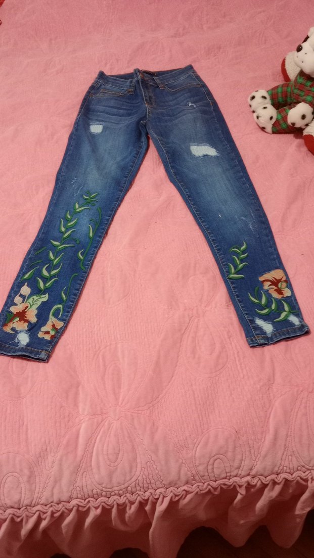 Düğmeli, nakışlı çiçek desenli mavi kot pantolon. Normal midi boy, rahat kesim, gündelik sokak stili için uygundur.