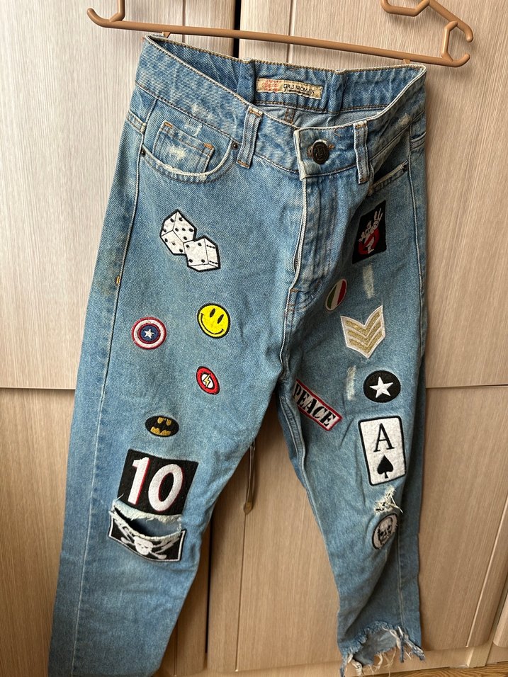 Nakışlı yamalar ve düğmeli kapanışa sahip pastel mavi kot pantolon, bol kesim ve normal boyda, günlük rahat stil için uygun.
