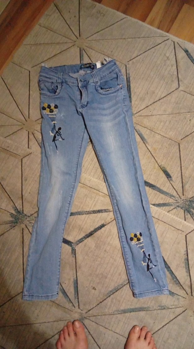 Nakış detaylı, düğmeli mavi kot pantolon. Normal boy midi kesim, rahat ve günlük sokak stili için uygun.