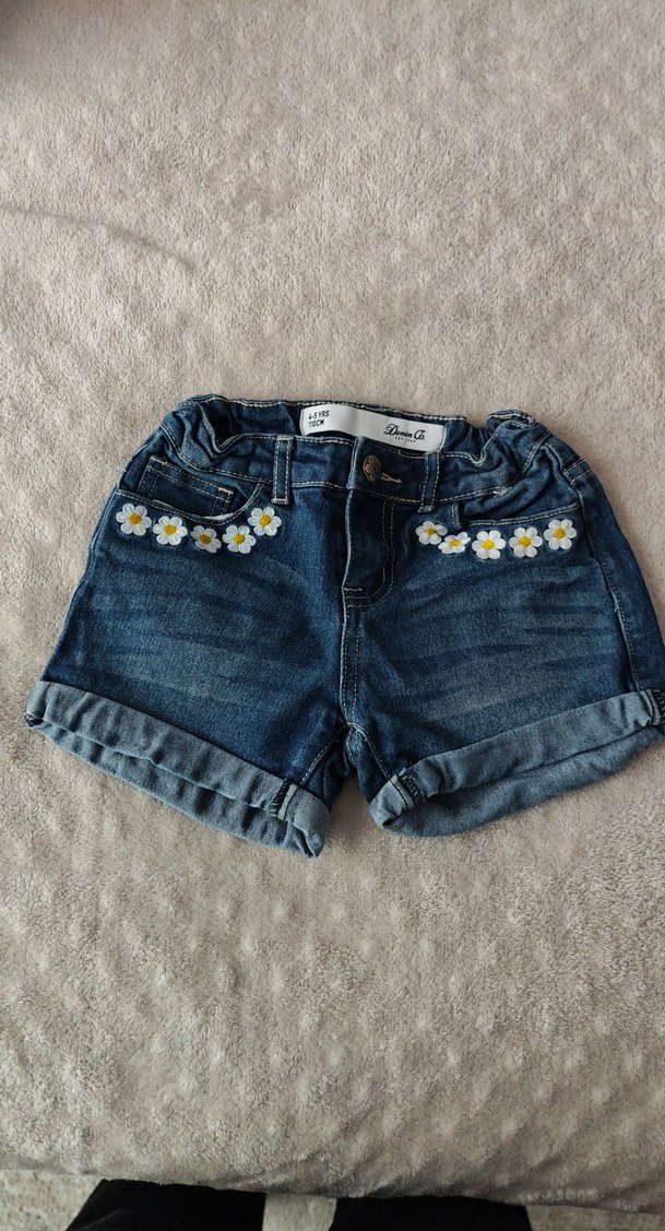 Düğmeli, bol kesim mavi kot şort, ön ceplerinde renkli papatya nakışlarıyla sokak tarzına uygun. 4/5 yaş için uygundur