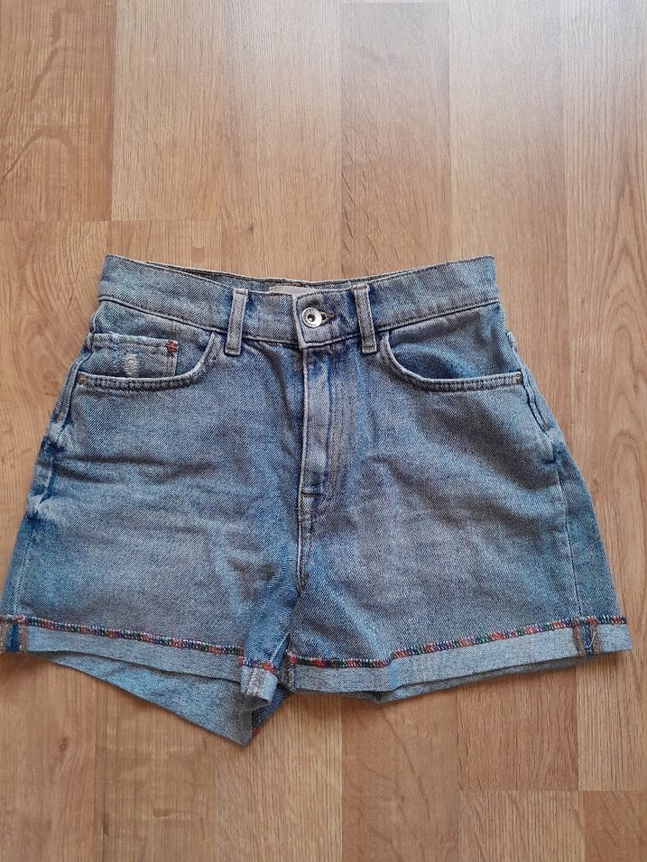 Düğmeli, nakışlı detaylara sahip, bol kesim kısa mavi kot şort. Günlük rahat kullanıma uygun.