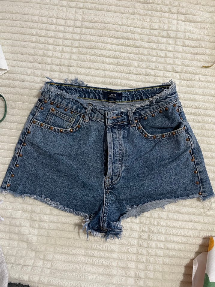 Mavi renkli, nakışlı ve düğmeli, bol kesim mini denim şort, herhangi bir yıpranması yok