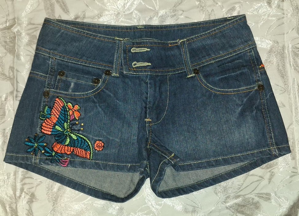 Renkli nakışlı, düğmeli, fitted kesim mavi kot mini şort, bohem tarz için uygundur. 36 bedendir.