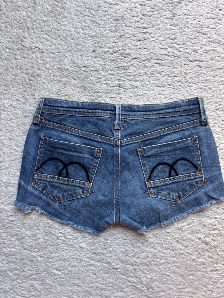 Düğmeli, nakışlı ceplere sahip, dar kesim mini kot şort. Trendy günlük kullanım için uygundur.