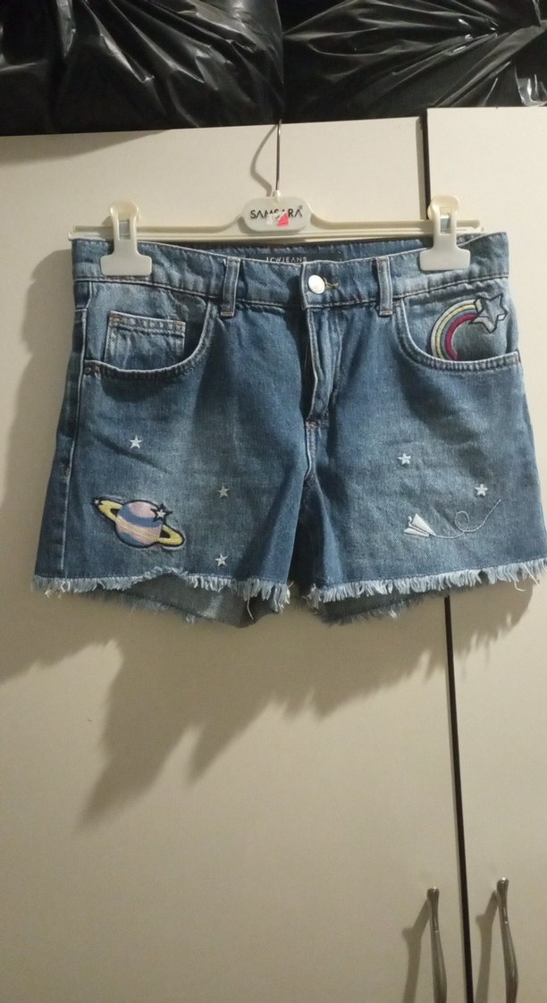 Nakışlı gökkuşağı ve gezegen desenleriyle loose fit mavi denim şort, düğmeli ve püsküllü kenarlarıyla rahat sokak stili için uygun.