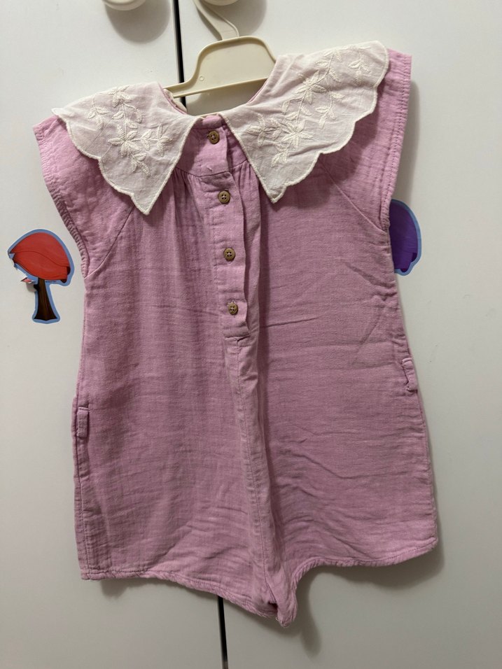 Nakışlı detaylara ve düğmeli öne sahip pastel pembe bebek tulumu. Geniş nakışlı yakasıyla şıklık katıyor. 3/4 yaş