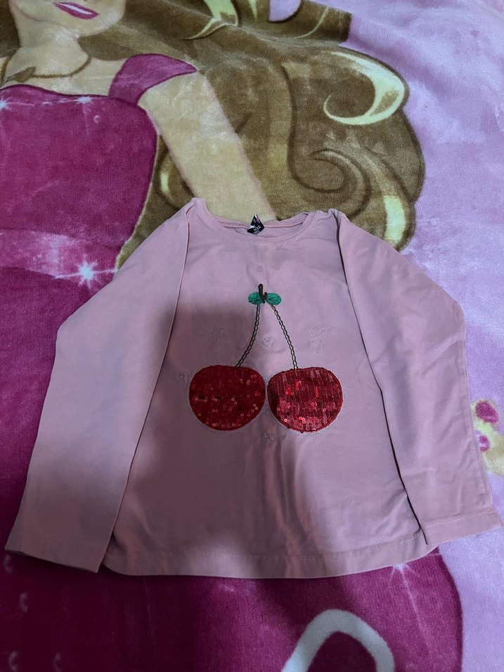 Pembe renkli, uzun kollu kız tişörtü, yuvarlak yaka ve bol kesimlidir. Nakışlı kiraz desenleri ve düğme detayları bulunur, sentetik kumaştan üretilmiştir.