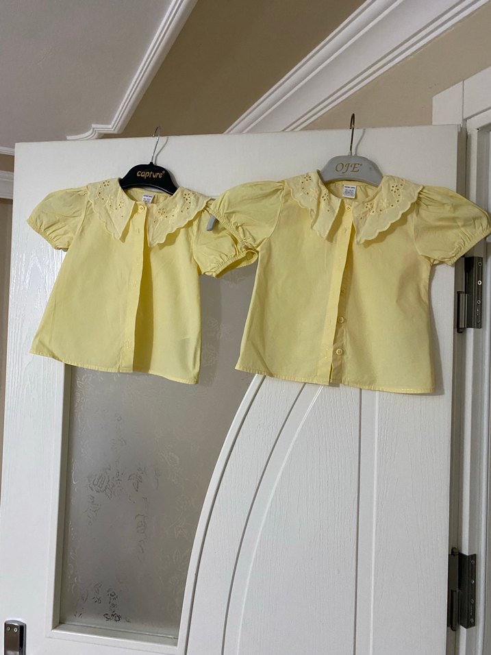 Vintage tarzda, nakışlı detaylı, düğmeli, kısa kollu, yakalı, pamuklu, bol kesim sarı kız çocuk gömleği. 2 adet ikizler için bir kez giyildi Pazarlık yapılır