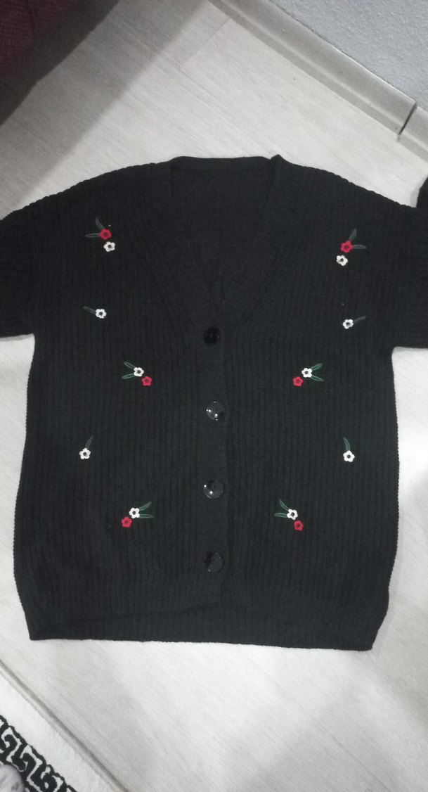 Düğmeli, uzun kollu ve yuvarlak yaka siyah triko hırka. Nakışlı çiçek detaylarıyla rahat ve gotik tarzda bir görünüm sağlar.