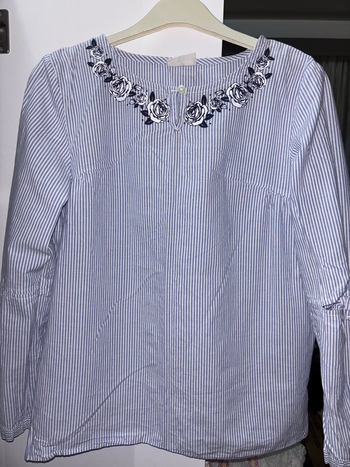 Bol kesim, yakalı ve uzun kollu kadın gömleği. Yaka kısmında çiçek işlemeli ve düğmeli detaylar bulunur. Pamuktan, mavi ve gri çizgili desene sahiptir. Rahat günlük kullanım için uygundur. 12 13 yaş ama M bedene kadar uygundur