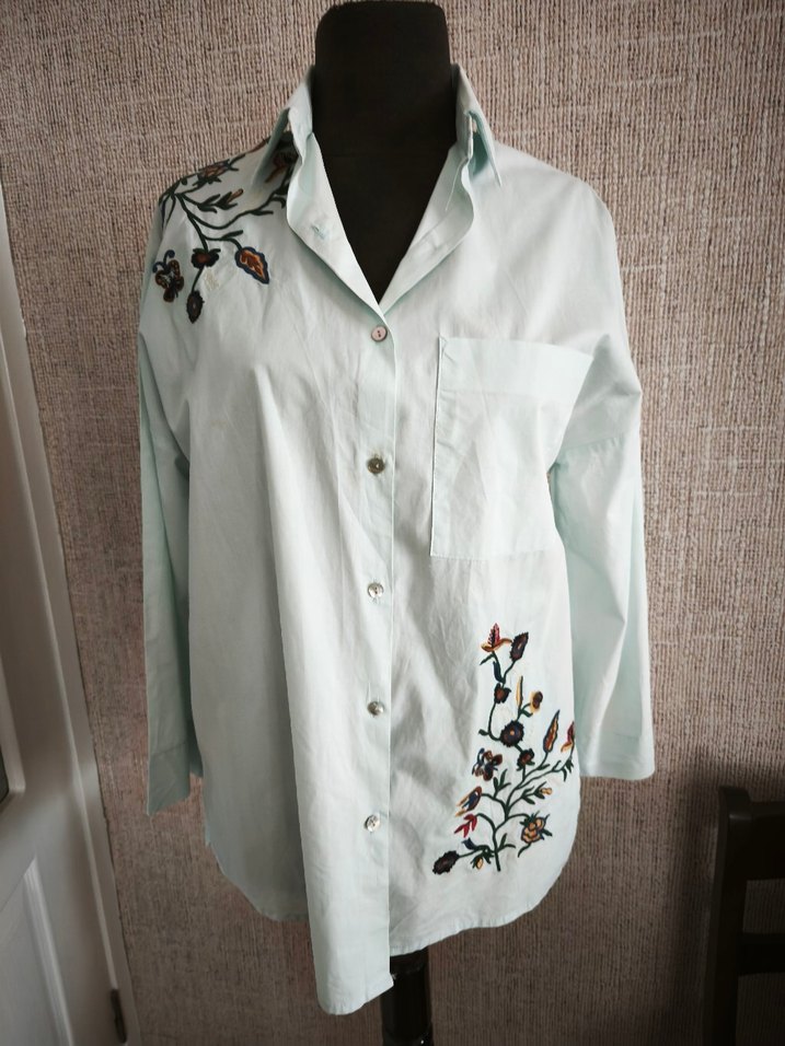 Bu pastel su yeşili pamuklu gömlek, uzun kollu ve yakalıdır. Düğmeli, bol kesim olup nakışlı çiçek detaylarıyla bohem tarz sunar. 38 ve 40 bedenler için uygundur