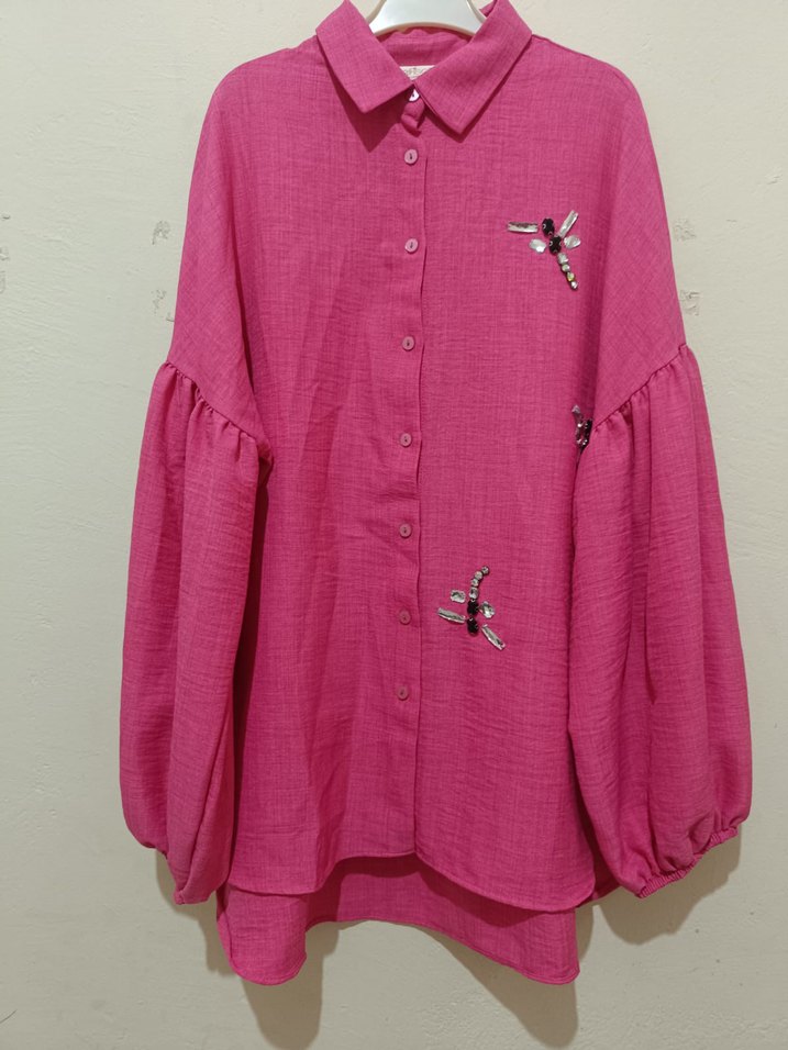Pembe, uzun kollu kadın gömlek, düğmeli ve bol kesimdir. Renkli nakışlarla süslenmiş, yakalı ve kısa boyda,80cm uzunluk günlük bohem tarz için uygundur.