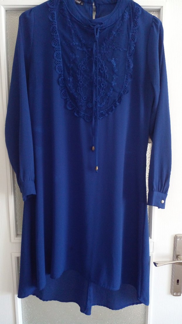 Uzun lacivert tunik, bol kesim, uzun kollu ve yuvarlak yakalıdır. Nakışlı detayları ve düğmeleri vardır, ipeksi kumaştan üretilmiştir, ofis için uygundur.