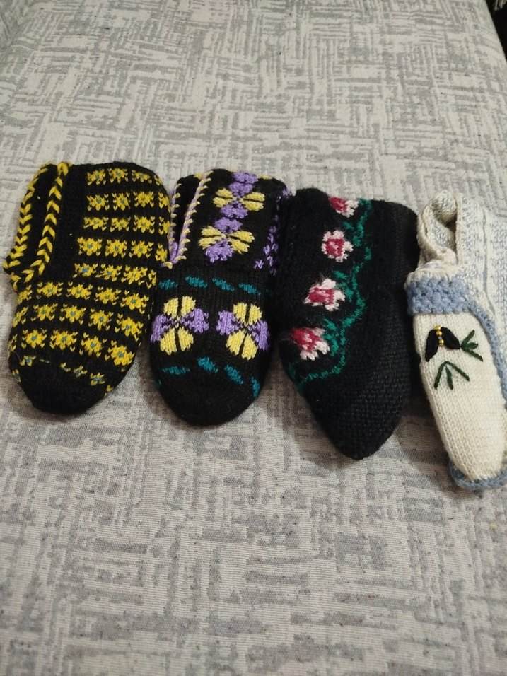 Nakışlı çiçek desenlerine sahip, koyu ve çok renkli el örgü kadın patikleri.Ceyizlik Günlük kullanım için bohem ve retro tarzda rahat bir seçenek. dört adet fiyatı tekli alım olur