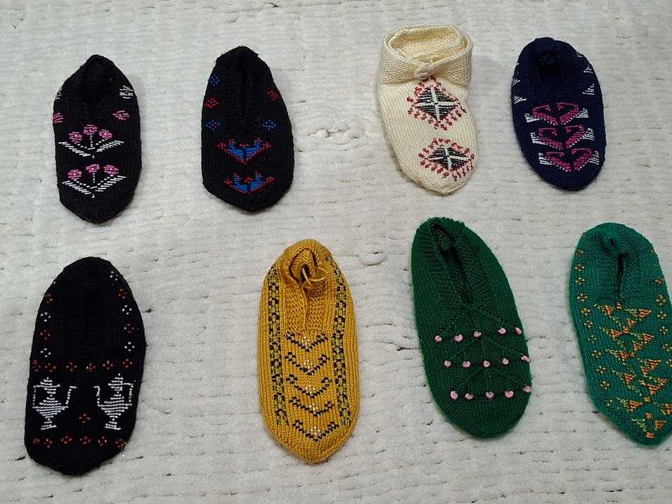 Nakışlı desenlere sahip, örgü kumaştan yapılmış, renkli patikler hepsi el emeği fiyat sorunuz