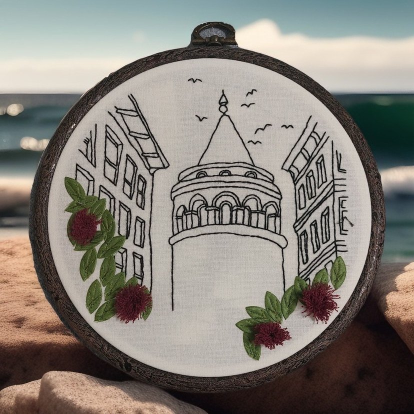 Bohem tarzda el yapımı nakış, galata kulesi çizimiyle, kabartmalı çiçek ve yaprak detaylarıyla zenginleştirilmiş.
