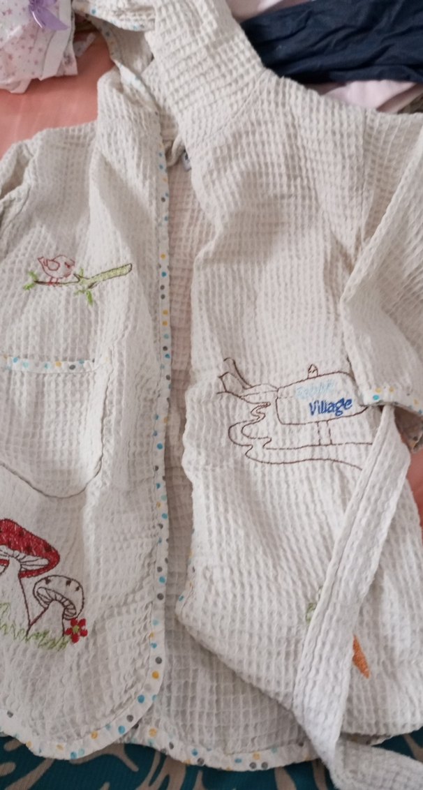 Nakışlı detaylara sahip, pastel beyaz yumuşak dokulu erkek çocuk bornozu. Düğmeli kapama ve dokulu yüzeyiyle konfor sağlar.